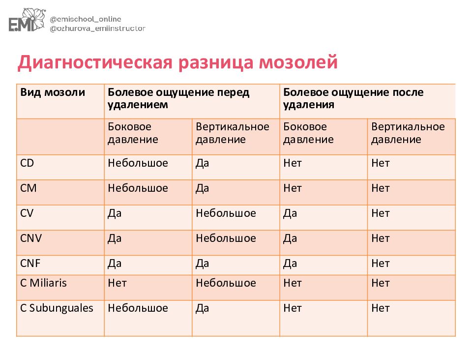 Вид мозоли Болевое ощущение перед удалением Болевое ощущение после удаления Боковое давление Вертикальное давление Боковое давление Вертикальное давление CD Небольшое Да Нет Нет CM Небольшое Да Нет Нет CV Да Небольшое Да Нет CNV Да Небольшое Да Нет CNF Да Да Да Нет C Miliaris Нет Небольшое Нет Нет C Subunguales Небольшое Да Нет Нет
