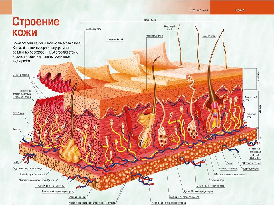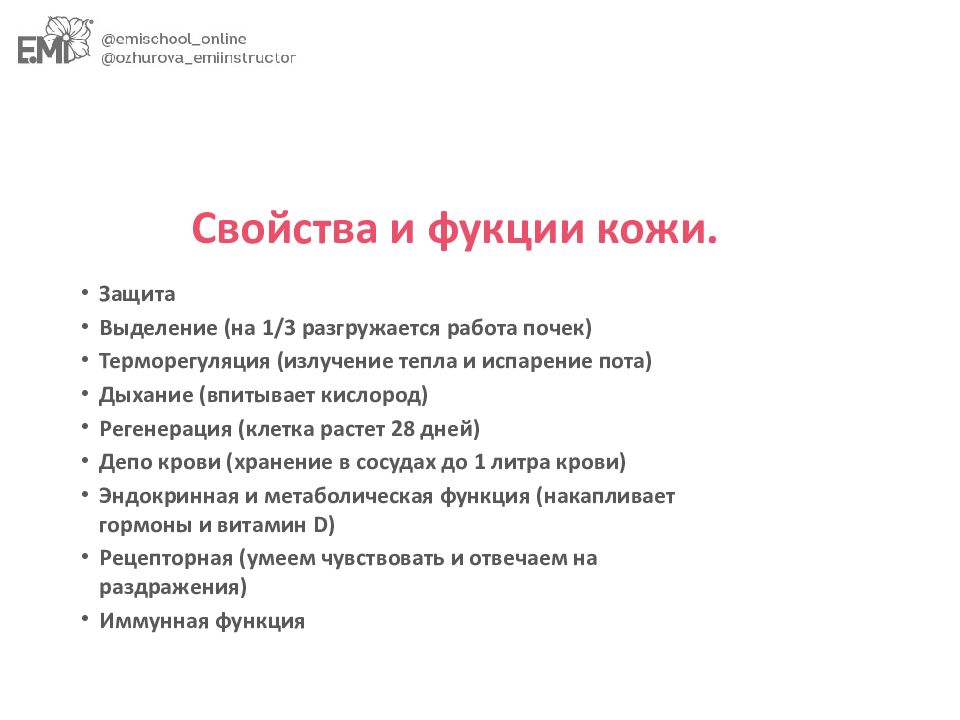 Защита Выделение (на 1/3 разгружается работа почек) Терморегуляция (излучение тепла и испарение пота) Дыхание (впитывает кислород) Регенерация (клетка растет 28 дней) Депо крови (хранение в сосудах до 1 литра крови) Эндокринная и метаболическая функция (накапливает гормоны и витамин D) Рецепторная (умеем чувствовать и отвечаем на раздражения) Иммунная функция