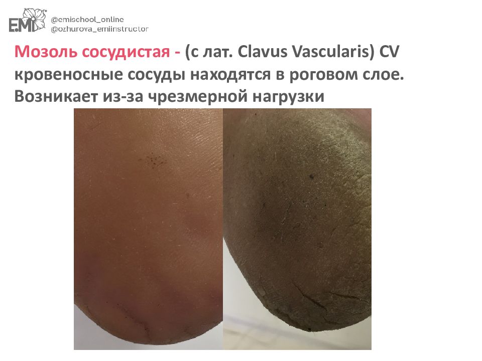 Слайд 9: Мозоль сосудистая - (с лат. Clavus Vascularis ) CV кровеносные сосуды находятся в роговом слое. Возникает из-за чрезмерной нагрузки