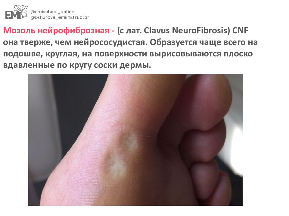 Слайд 11: Мозоль нейрофиброзная - (с лат. Clavus NeuroFibrosis ) CNF она тверже, чем нейрососудистая. Образуется чаще всего на подошве, круглая, на поверхности вырисовываются плоско вдавленные по кругу соски дермы
