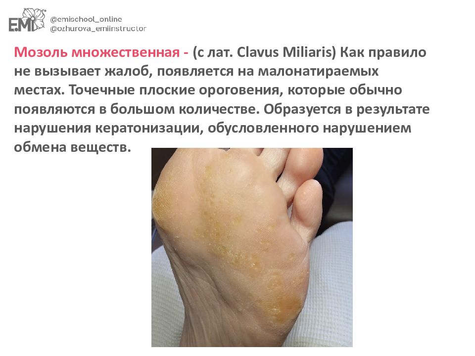 Слайд 12: Мозоль множественная - (с лат. Clavus Miliaris ) Как правило не вызывает жалоб, появляется на малонатираемых местах. Точечные плоские ороговения, которые обычно появляются в большом количестве. Образуется в результате нарушения кератонизации, обусловленного нарушением обмена веществ