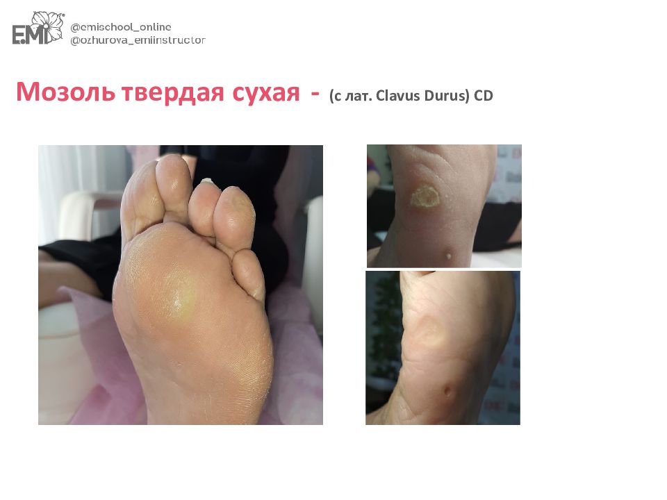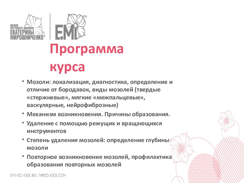 Мозоли: локализация, диагностика, определение и отличие от бородавок, виды мозолей (твердые «стержневые», мягкие «межпальцевые», васкулярные, нейрофиброзные ) Механизм возникновения. Причины образования. Удаление с помощью режущих и вращающихся инструментов Степень удаления мозолей: определение глубины мозоли Повторное возникновение мозолей, профилактика образования повторных мозолей Программа курса