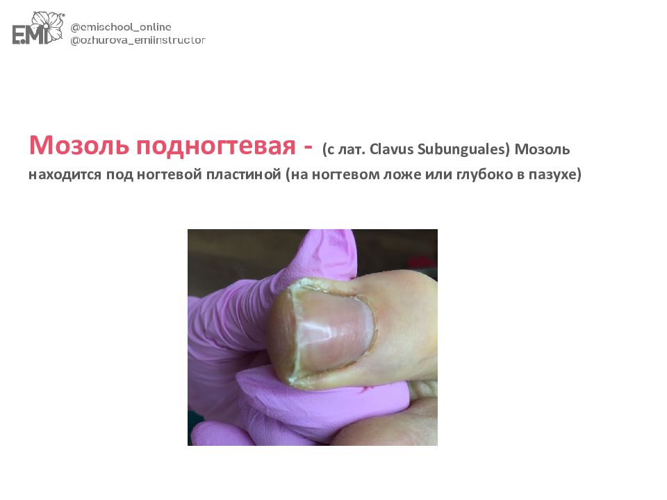 Слайд 13: Мозоль подногтевая - (с лат. Clavus Subunguales ) Мозоль находится под ногтевой пластиной (на ногтевом ложе или глубоко в пазухе)