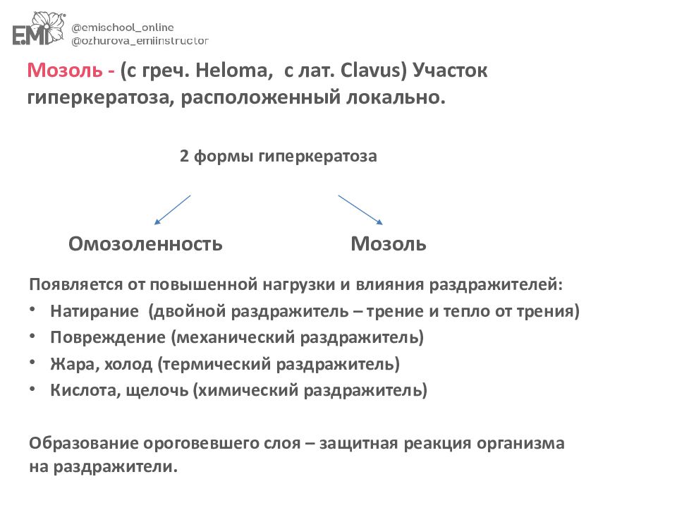 2 формы гиперкератоза Мозоль - (с греч. Heloma, с лат. Clavus ) Участок гиперкератоза, расположенный локально. Омозоленность Мозоль Появляется от повышенной нагрузки и влияния раздражителей: Натирание (двойной раздражитель – трение и тепло от трения) Повреждение (механический раздражитель) Жара, холод (термический раздражитель) Кислота, щелочь (химический раздражитель) Образование ороговевшего слоя – защитная реакция организма на раздражители.