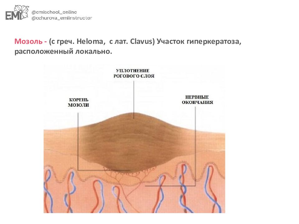 Слайд 6: Мозоль - (с греч. Heloma, с лат. Clavus ) Участок гиперкератоза, расположенный локально