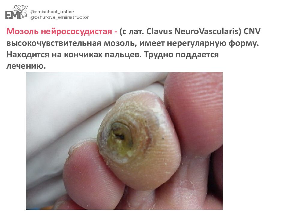 Слайд 10: Мозоль нейрососудистая - (с лат. Clavus NeuroVascularis ) CNV высокочувствительная мозоль, имеет нерегулярную форму. Находится на кончиках пальцев. Трудно поддается лечению