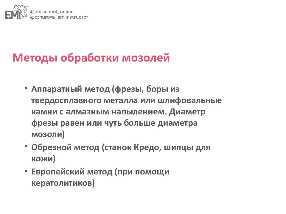Аппаратный метод (фрезы, боры из твердосплавного металла или шлифовальные камни с алмазным напылением. Диаметр фрезы равен или чуть больше диаметра мозоли) Обрезной метод (станок Кредо, шипцы для кожи) Европейский метод (при помощи кератолитиков )