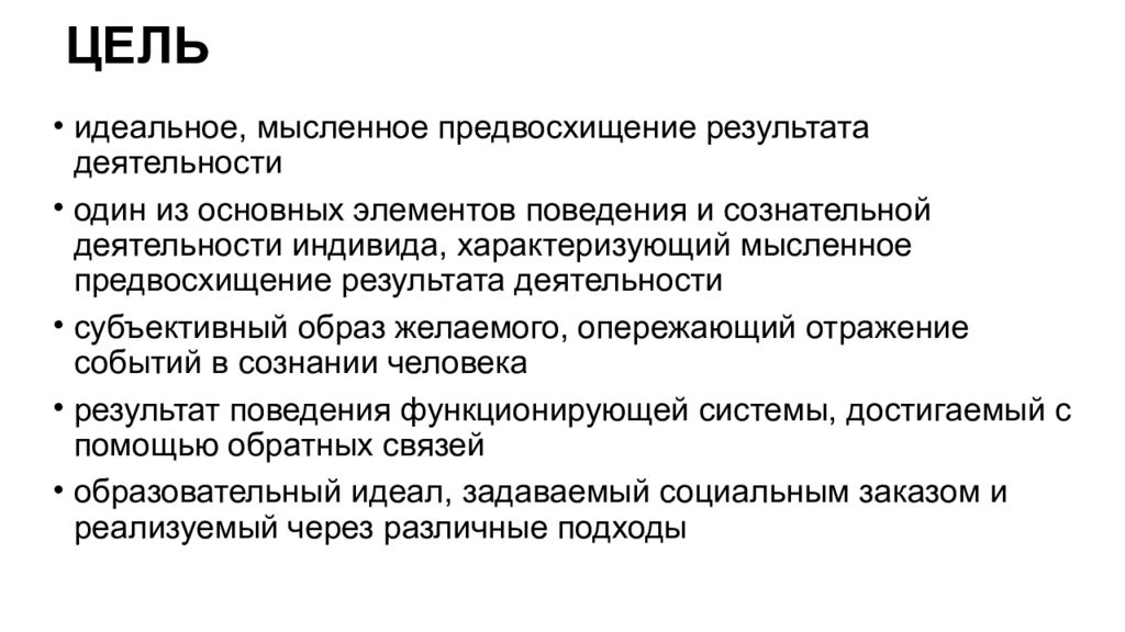 идеальное, мысленное предвосхищение результата деятельности один из основных элементов поведения и сознательной деятельности индивида, характеризующий мысленное предвосхищение результата деятельности субъективный образ желаемого, опережающий отражение событий в сознании человека результат поведения функционирующей системы, достигаемый с помощью обратных связей образовательный идеал, задаваемый социальным заказом и реализуемый через различные подходы