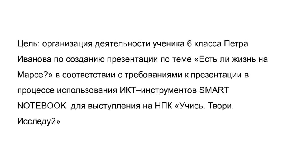 Цель: организация деятельности ученика 6 класса Петра Иванова по созданию презентации по теме «Есть ли жизнь на Марсе ? » в соответствии с требованиями к презентации в процессе использования ИКТ–инструментов SMART NOTEBOOK для выступления на НПК «Учись. Твори. Исследуй»
