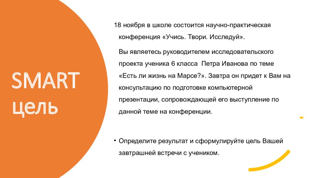 18 ноября в школе состоится научно-практическая конференция «Учись. Твори. Исследуй». Вы являетесь руководителем исследовательского проекта ученика 6 класса Петра Иванова по теме «Есть ли жизнь на Марсе?». Завтра он придет к Вам на консультацию по подготовке компьютерной презентации, сопровождающей его выступление по данной теме на конференции. Определите результат и сформулируйте цель Вашей завтрашней встречи с учеником.