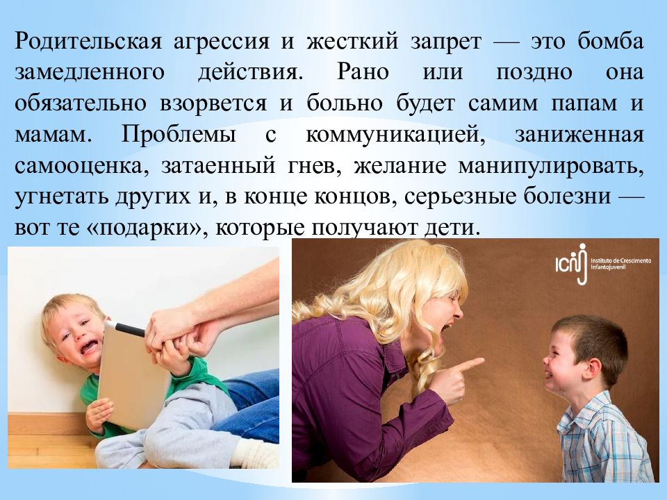 Родительская агрессия и жесткий запрет — это бомба замедленного действия. Рано или поздно она обязательно взорвется и больно будет самим папам и мамам. Проблемы с коммуникацией, заниженная самооценка, затаенный гнев, желание манипулировать, угнетать других и, в конце концов, серьезные болезни — вот те «подарки», которые получают дети.