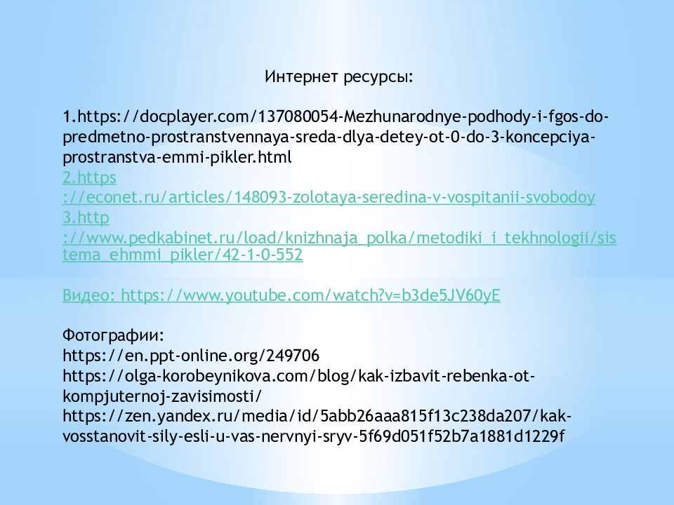 Интернет ресурсы: 1.https :// docplayer.com/137080054-Mezhunarodnye-podhody-i-fgos-do-predmetno-prostranstvennaya-sreda-dlya-detey-ot-0-do-3-koncepciya-prostranstva-emmi-pikler.html 2.https ://econet.ru/articles/148093-zolotaya-seredina-v-vospitanii-svobodoy 3.http ://www.pedkabinet.ru/load/knizhnaja_polka/metodiki_i_tekhnologii/sistema_ehmmi_pikler/42-1-0-552 Видео: https ://www.youtube.com/watch?v=b3de5JV60yE Фотографии: https://en.ppt-online.org/249706 https://olga-korobeynikova.com/blog/kak-izbavit-rebenka-ot-kompjuternoj-zavisimosti/ https ://zen.yandex.ru/media/id/5abb26aaa815f13c238da207/kak-vosstanovit-sily-esli-u-vas-nervnyi-sryv-5f69d051f52b7a1881d1229f