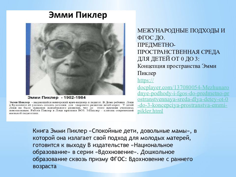 МЕЖУНАРОДНЫЕ ПОДХОДЫ И ФГОС ДО. ПРЕДМЕТНО-ПРОСТРАНСТВЕННАЯ СРЕДА ДЛЯ ДЕТЕЙ ОТ 0 ДО 3: Концепция пространства Эмми Пиклер https:// docplayer.com/137080054-Mezhunarodnye-podhody-i-fgos-do-predmetno-prostranstvennaya-sreda-dlya-detey-ot-0-do-3-koncepciya-prostranstva-emmi-pikler.html Книга Эмми Пиклер «Спокойные дети, довольные мамы», в которой она излагает свой подход для молодых матерей, готовится к выходу В издательстве «Национальное образование» в серии «Вдохновение». Дошкольное образование сквозь призму ФГОС: Вдохновение с раннего возраста
