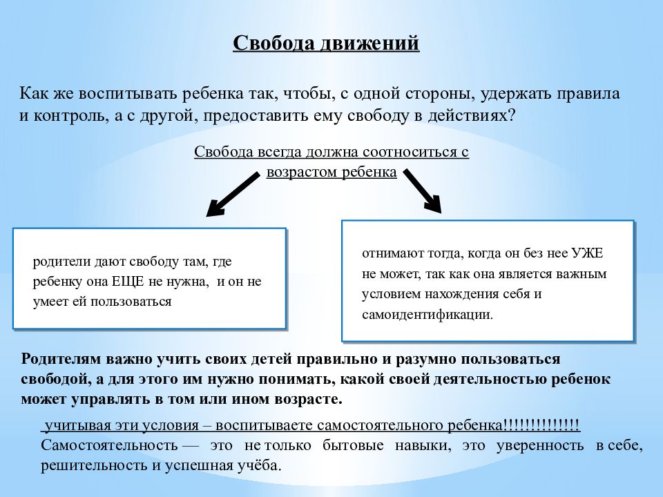 Свобода движений Как же воспитывать ребенка так, чтобы, с одной стороны, удержать правила и контроль, а с другой, предоставить ему свободу в действиях? Свобода всегда должна соотноситься с возрастом ребенка родители дают свободу там, где ребенку она ЕЩЕ не нужна, и он не умеет ей пользоваться отнимают тогда, когда он без нее УЖЕ не может, так как она является важным условием нахождения себя и самоидентификации. Родителям важно учить своих детей правильно и разумно пользоваться свободой, а для этого им нужно понимать, какой своей деятельностью ребенок может управлять в том или ином возрасте. учитывая эти условия – воспитываете самостоятельного ребенка!!!!!!!!!!!!!! Самостоятельность — это не только бытовые навыки, это уверенность в себе, решительность и успешная учёба.