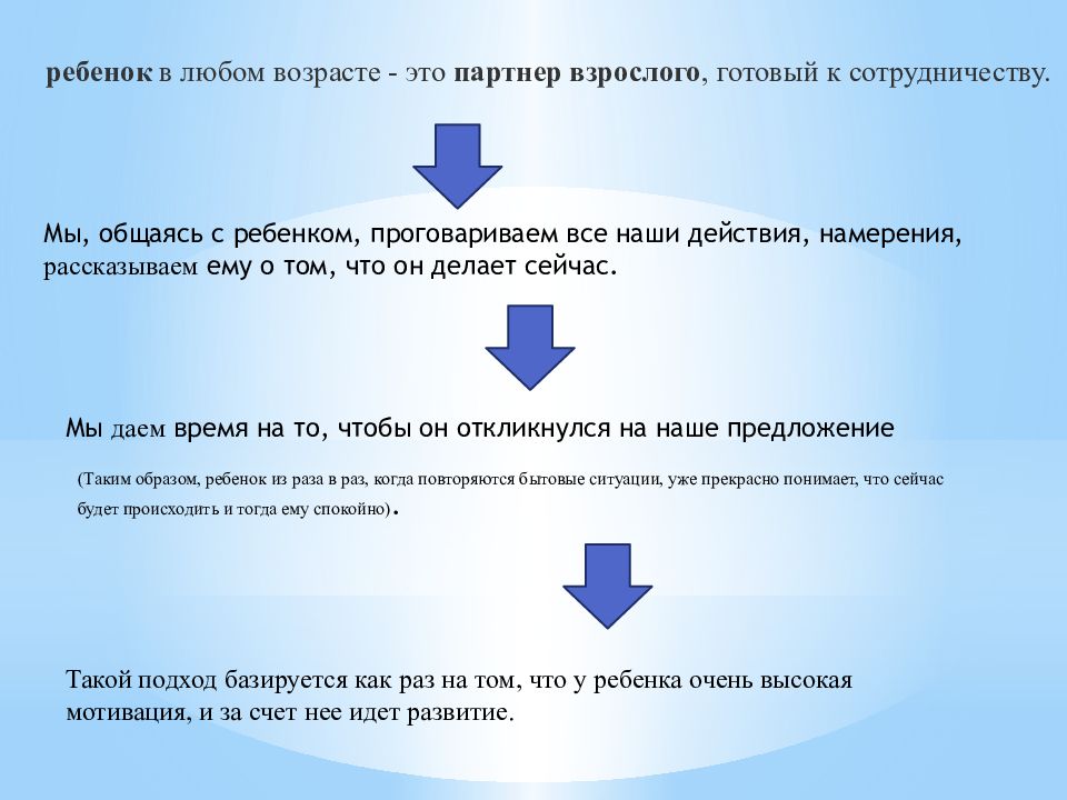 ребенок в любом возрасте - это партнер взрослого, готовый к сотрудничеству. Мы, общаясь с ребенком, проговариваем все наши действия, намерения, рассказываем ему о том, что он делает сейчас. Мы даем время на то, чтобы он откликнулся на наше предложение (Таким образом, ребенок из раза в раз, когда повторяются бытовые ситуации, уже прекрасно понимает, что сейчас будет происходить и тогда ему спокойно). Такой подход базируется как раз на том, что у ребенка очень высокая мотивация, и за счет нее идет развитие.