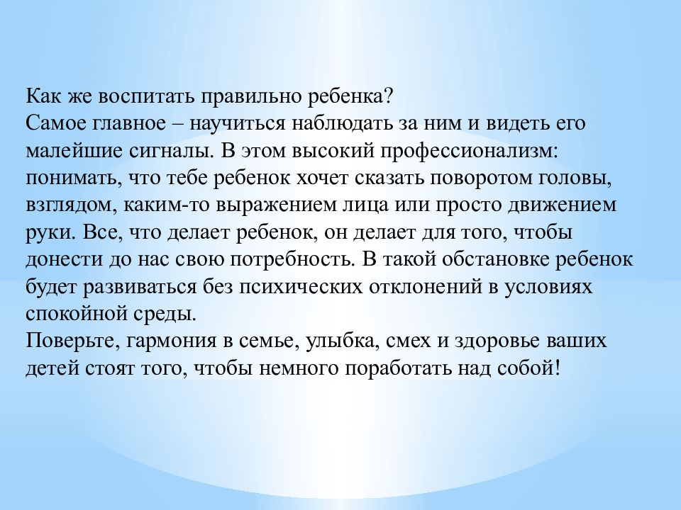 Как же воспитать правильно ребенка? Самое главное – научиться наблюдать за ним и видеть его малейшие сигналы. В этом высокий профессионализм: понимать, что тебе ребенок хочет сказать поворотом головы, взглядом, каким-то выражением лица или просто движением руки. Все, что делает ребенок, он делает для того, чтобы донести до нас свою потребность. В такой обстановке ребенок будет развиваться без психических отклонений в условиях спокойной среды. Поверьте, гармония в семье, улыбка, смех и здоровье ваших детей стоят того, чтобы немного поработать над собой!