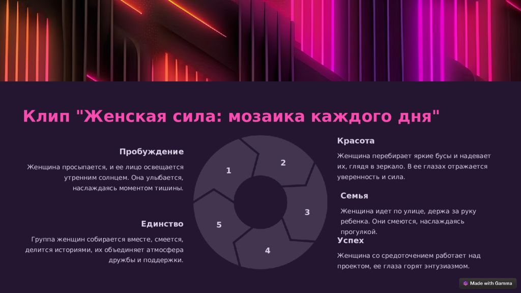 Клип "Женская сила: мозаика каждого дня" Пробуждение Женщина просыпается, и ее лицо освещается утренним солнцем. Она улыбается, наслаждаясь моментом тишины. 1 Красота Женщина перебирает яркие бусы и надевает их, глядя в зеркало. В ее глазах отражается уверенность и сила. 2 Семья Женщина идет по улице, держа за руку ребенка. Они смеются, наслаждаясь прогулкой. 3 Успех Женщина со средоточением работает над проектом, ее глаза горят энтузиазмом. 4 Единство Группа женщин собирается вместе, смеется, делится историями, их объединяет атмосфера дружбы и поддержки. 5