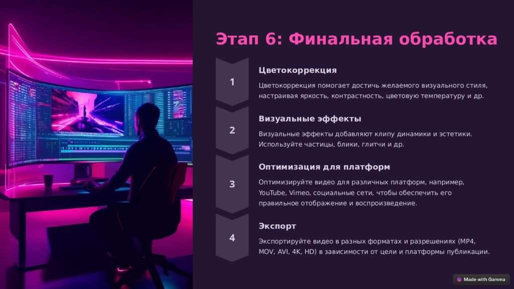 Этап 6: Финальная обработка Цветокоррекция Цветокоррекция помогает достичь желаемого визуального стиля, настраивая яркость, контрастность, цветовую температуру и др. Визуальные эффекты Визуальные эффекты добавляют клипу динамики и эстетики. Используйте частицы, блики, глитчи и др. Оптимизация для платформ Оптимизируйте видео для различных платформ, например, YouTube, Vimeo, социальные сети, чтобы обеспечить его правильное отображение и воспроизведение. Экспорт Экспортируйте видео в разных форматах и разрешениях (MP4, MOV, AVI, 4K, HD) в зависимости от цели и платформы публикации.