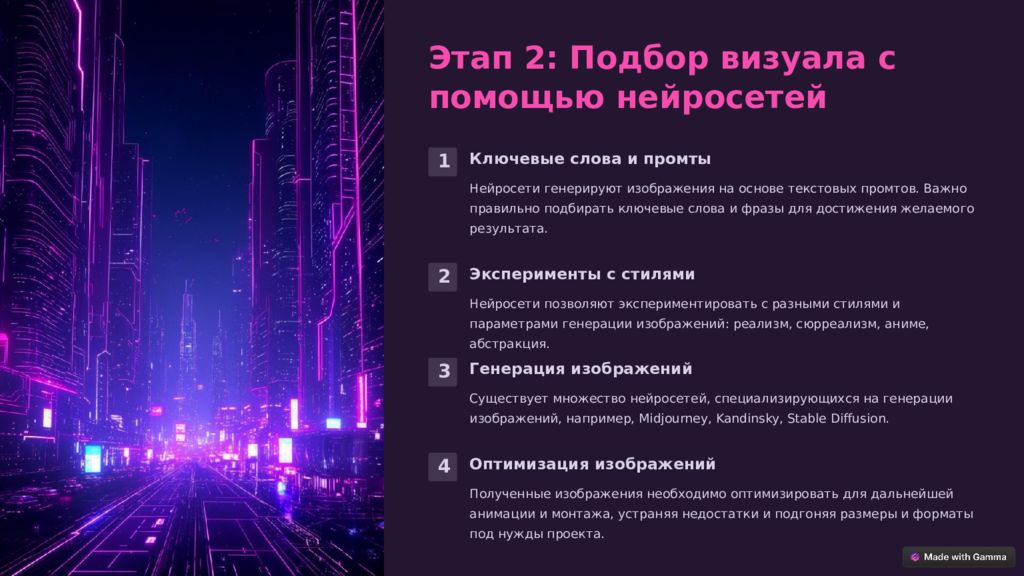 Этап 2: Подбор визуала с помощью нейросетей 1 Ключевые слова и промты Нейросети генерируют изображения на основе текстовых промтов. Важно правильно подбирать ключевые слова и фразы для достижения желаемого результата. 2 Эксперименты с стилями Нейросети позволяют экспериментировать с разными стилями и параметрами генерации изображений: реализм, сюрреализм, аниме, абстракция. 3 Генерация изображений Существует множество нейросетей, специализирующихся на генерации изображений, например, Midjourney, Kandinsky, Stable Diffusion. 4 Оптимизация изображений Полученные изображения необходимо оптимизировать для дальнейшей анимации и монтажа, устраняя недостатки и подгоняя размеры и форматы под нужды проекта.