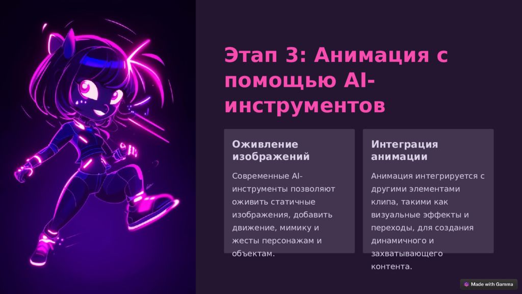 Этап 3: Анимация с помощью AI-инструментов Оживление изображений Современные AI-инструменты позволяют оживить статичные изображения, добавить движение, мимику и жесты персонажам и объектам. Интеграция анимации Анимация интегрируется с другими элементами клипа, такими как визуальные эффекты и переходы, для создания динамичного и захватывающего контента.