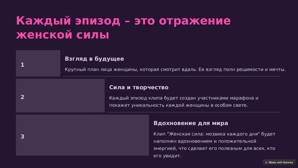 Каждый эпизод – это отражение женской силы 1 Взгляд в будущее Крупный план лица женщины, которая смотрит вдаль. Ее взгляд полн решимости и мечты. 2 Сила и творчество Каждый эпизод клипа будет создан участниками марафона и покажет уникальность каждой женщины в особом свете. 3 Вдохновение для мира Клип "Женская сила: мозаика каждого дня" будет наполнен вдохновением и положительной энергией, что сделает его полезным для всех, кто его увидит.