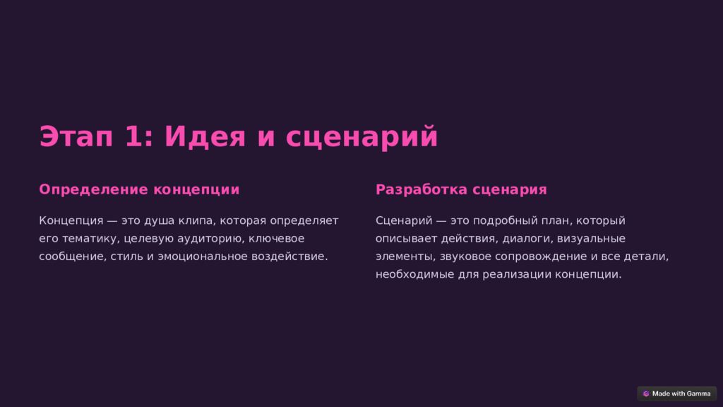 Этап 1: Идея и сценарий Определение концепции Концепция — это душа клипа, которая определяет его тематику, целевую аудиторию, ключевое сообщение, стиль и эмоциональное воздействие. Разработка сценария Сценарий — это подробный план, который описывает действия, диалоги, визуальные элементы, звуковое сопровождение и все детали, необходимые для реализации концепции.