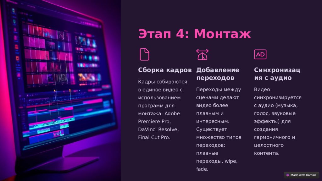 Этап 4: Монтаж Сборка кадров Кадры собираются в единое видео с использованием программ для монтажа: Adobe Premiere Pro, DaVinci Resolve, Final Cut Pro. Добавление переходов Переходы между сценами делают видео более плавным и интересным. Существует множество типов переходов: плавные переходы, wipe, fade. Синхронизация с аудио Видео синхронизируется с аудио (музыка, голос, звуковые эффекты) для создания гармоничного и целостного контента.