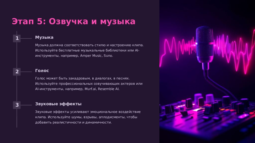 Этап 5: Озвучка и музыка 1 Музыка Музыка должна соответствовать стилю и настроению клипа. Используйте бесплатные музыкальные библиотеки или AI-инструменты, например, Amper Music, Suno. 2 Голос Голос может быть закадровым, в диалогах, в песнях. Используйте профессиональных озвучивающих актеров или AI-инструменты, например, Murf.ai, Resemble AI. 3 Звуковые эффекты Звуковые эффекты усиливают эмоциональное воздействие клипа. Используйте шумы, взрывы, аплодисменты, чтобы добавить реалистичности и динамичности.