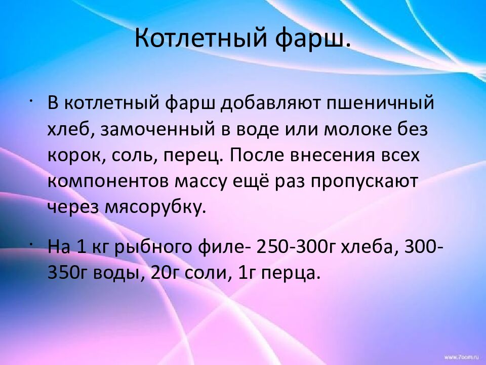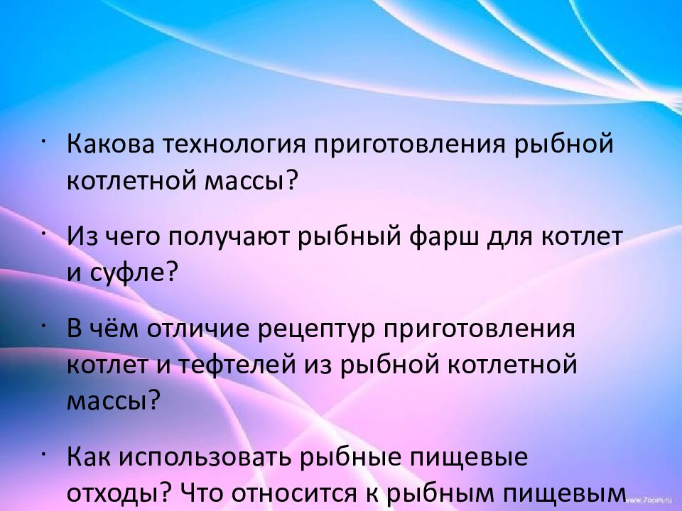 Какова технология приготовления рыбной котлетной массы? Из чего получают рыбный фарш для котлет и суфле? В чём отличие рецептур приготовления котлет и тефтелей из рыбной котлетной массы? Как использовать рыбные пищевые отходы? Что относится к рыбным пищевым отходам? Какие виды морепродуктов используют в общественном питании?