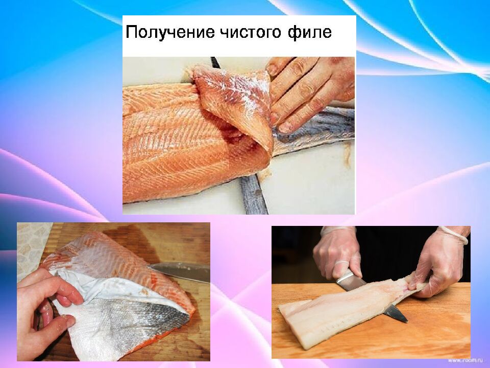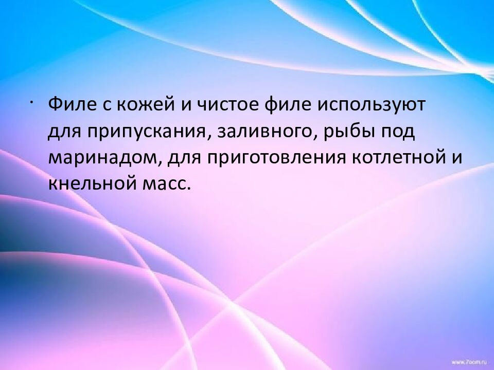 Филе с кожей и чистое филе используют для припускания, заливного, рыбы под маринадом, для приготовления котлетной и кнельной масс.