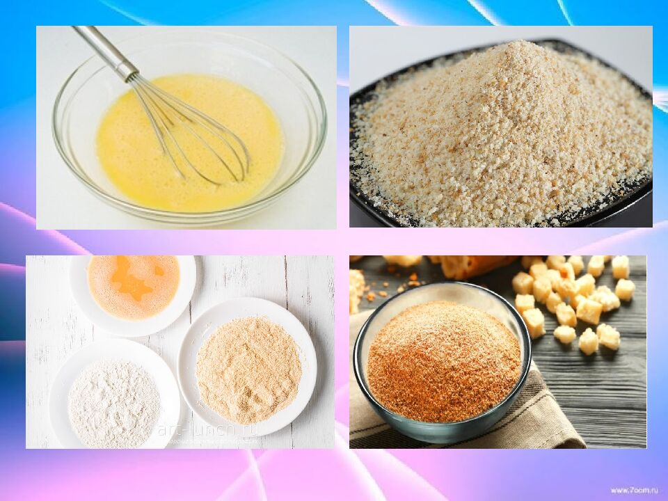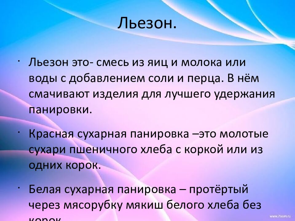 Льезон это- смесь из яиц и молока или воды с добавлением соли и перца. В нём смачивают изделия для лучшего удержания панировки. Красная сухарная панировка –это молотые сухари пшеничного хлеба с коркой или из одних корок. Белая сухарная панировка – протёртый через мясорубку мякиш белого хлеба без корок.