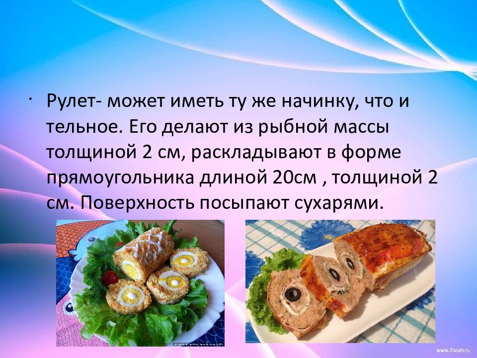 Рулет- может иметь ту же начинку, что и тельное. Его делают из рыбной массы толщиной 2 см, раскладывают в форме прямоугольника длиной 20см, толщиной 2 см. Поверхность посыпают сухарями.