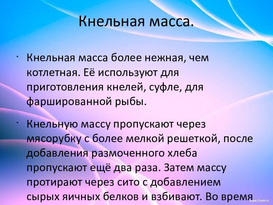Кнельная масса более нежная, чем котлетная. Её используют для приготовления кнелей, суфле, для фаршированной рыбы. Кнельную массу пропускают через мясорубку с более мелкой решеткой, после добавления размоченного хлеба пропускают ещё два раза. Затем массу протирают через сито с добавлением сырых яичных белков и взбивают. Во время взбивания тонкой струйкой вливают сливки. В конце добавляют соль. Масса готова, если её кусочек, опущенный в воду, держится на поверхности.