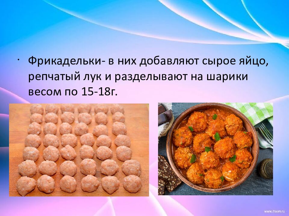 Фрикадельки- в них добавляют сырое яйцо, репчатый лук и разделывают на шарики весом по 15-18г.