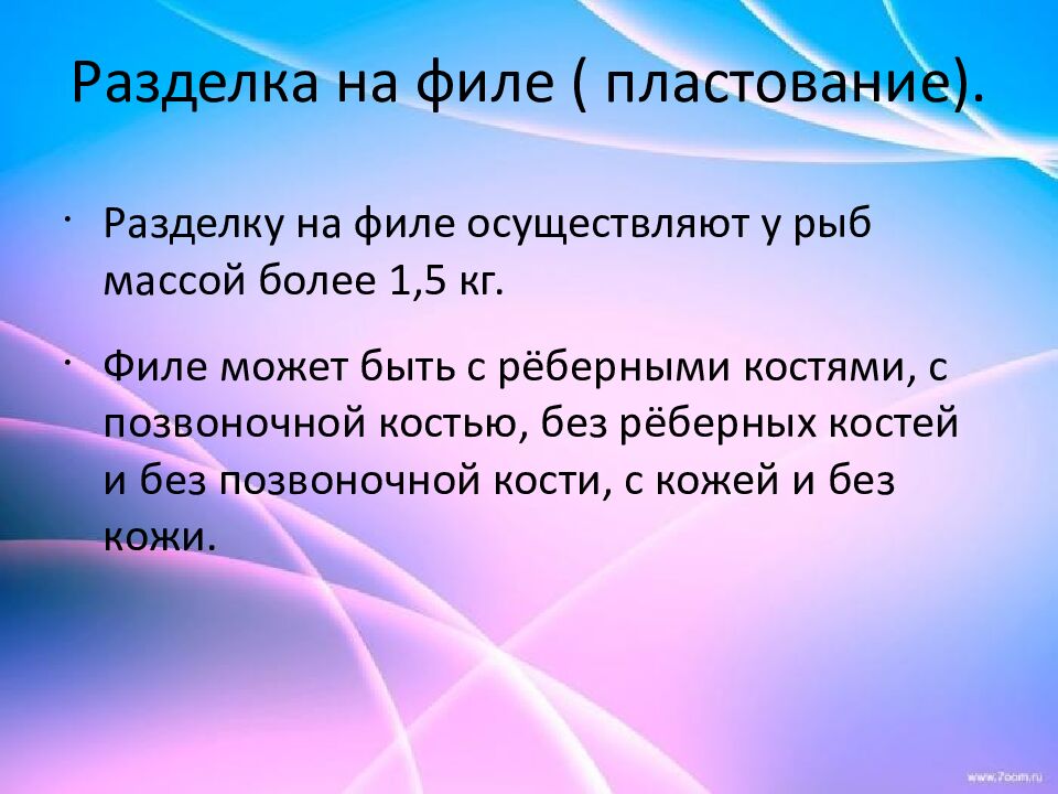 Разделку на филе осуществляют у рыб массой более 1,5 кг. Филе может быть с рёберными костями, с позвоночной костью, без рёберных костей и без позвоночной кости, с кожей и без кожи.