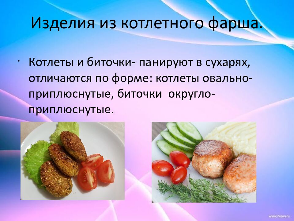 Котлеты и биточки- панируют в сухарях, отличаются по форме: котлеты овально- приплюснутые, биточки округло-приплюснутые.