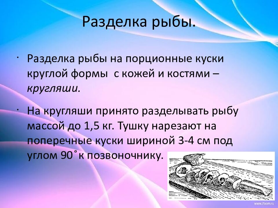 Разделка рыбы на порционные куски круглой формы с кожей и костями – кругляши. На кругляши принято разделывать рыбу массой до 1,5 кг. Тушку нарезают на поперечные куски шириной 3-4 см под углом 90 ̊к позвоночнику.
