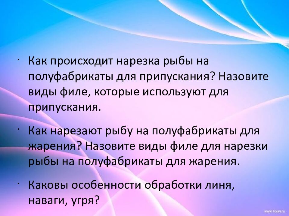 Как происходит нарезка рыбы на полуфабрикаты для припускания? Назовите виды филе, которые используют для припускания. Как нарезают рыбу на полуфабрикаты для жарения? Назовите виды филе для нарезки рыбы на полуфабрикаты для жарения. Каковы особенности обработки линя, наваги, угря? В чём особенности разделки осетровых рыб? Для чего необходимо зашпаривать звенья осетровых рыб? Какова технология нарезки порционных полуфабрикатов для припускания и жарки из звена осетровых рыб?