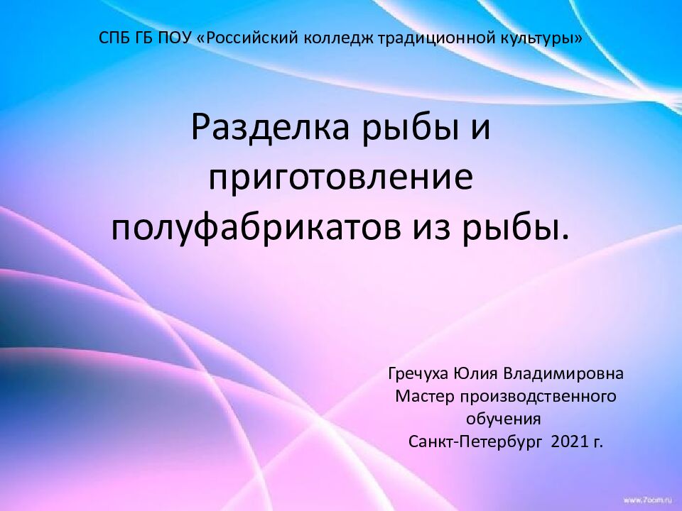 Первый слайд презентации: СПБ ГБ ПОУ «Российский колледж традиционной культуры» Разделка рыбы и приготовление полуфабрикатов из рыбы