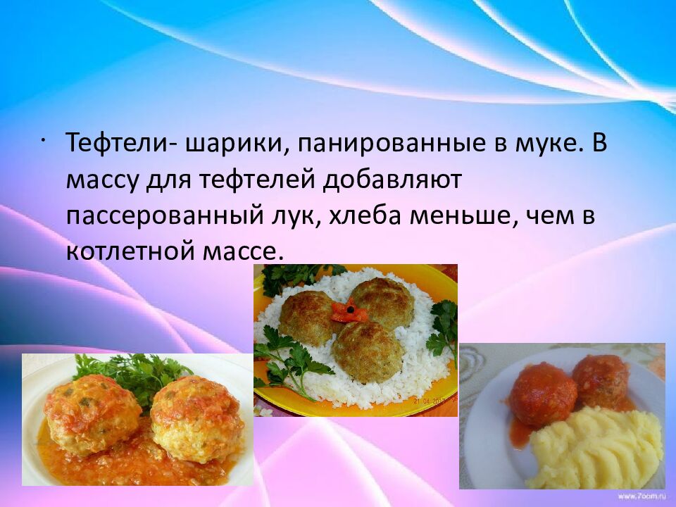 Тефтели- шарики, панированные в муке. В массу для тефтелей добавляют пассерованный лук, хлеба меньше, чем в котлетной массе.