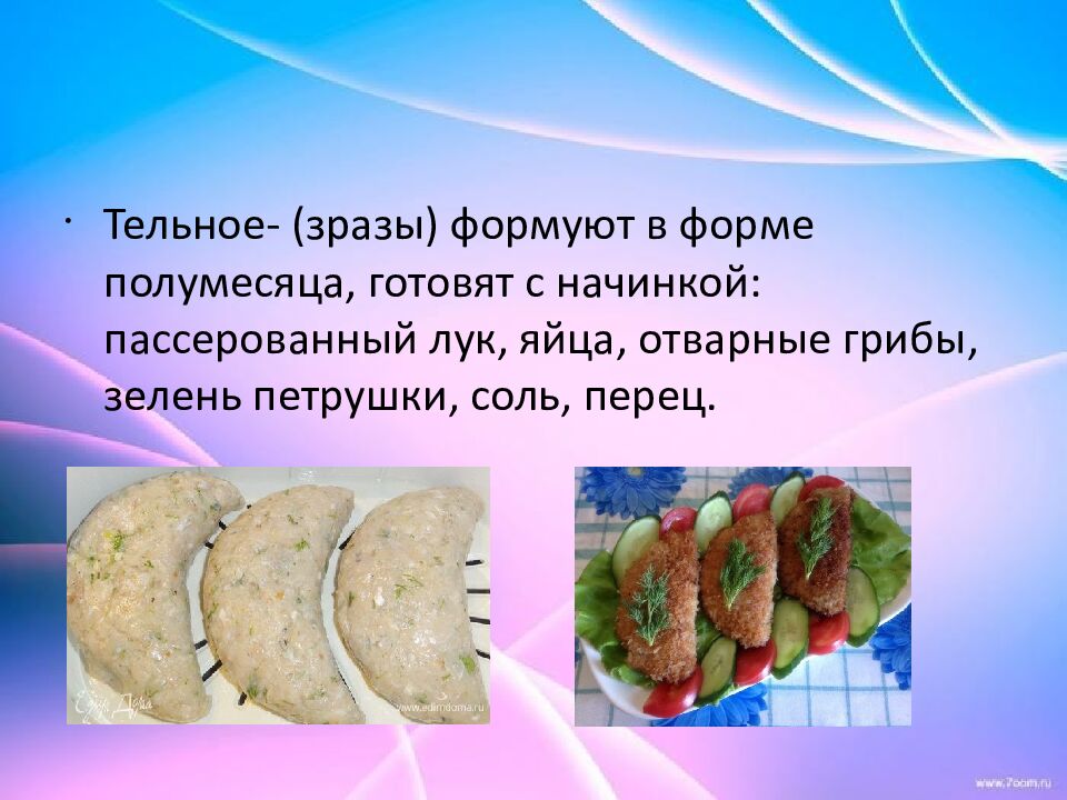 Тельное- (зразы) формуют в форме полумесяца, готовят с начинкой: пассерованный лук, яйца, отварные грибы, зелень петрушки, соль, перец.