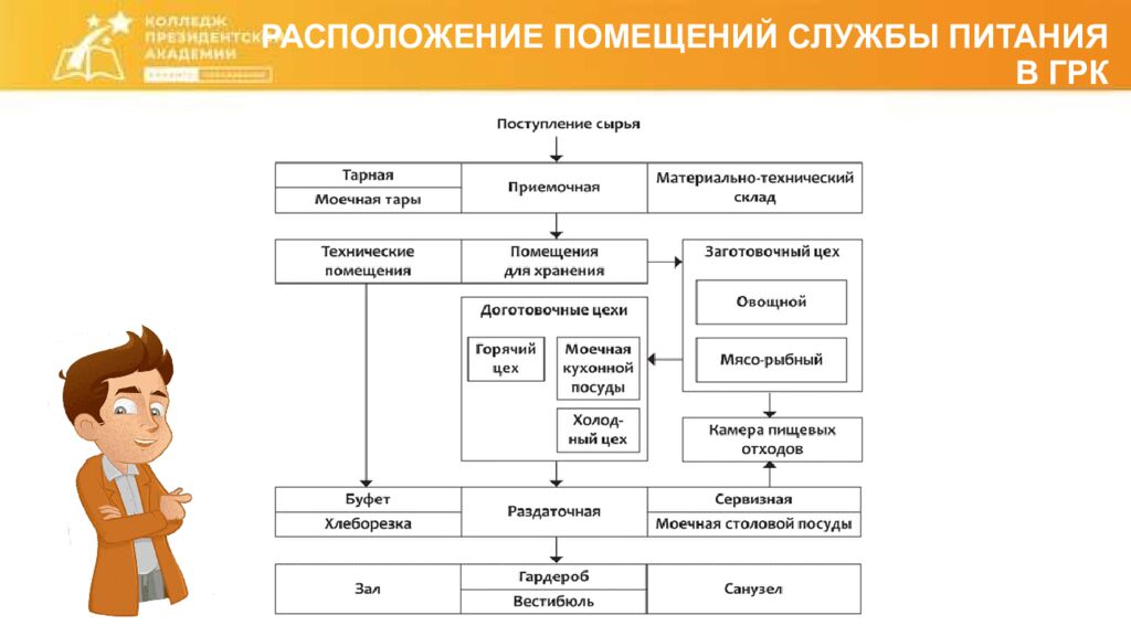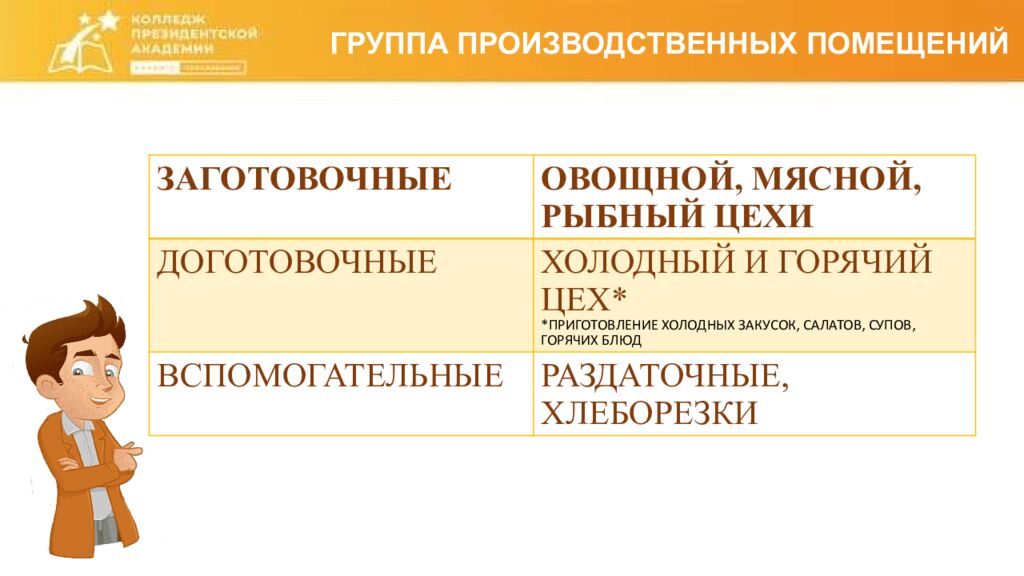 ГРУППА ПРОИЗВОДСТВЕННЫХ ПОМЕЩЕНИЙ ЗАГОТОВОЧНЫЕ ОВОЩНОЙ, МЯСНОЙ, РЫБНЫЙ ЦЕХИ ДОГОТОВОЧНЫЕ ХОЛОДНЫЙ И ГОРЯЧИЙ ЦЕХ* *ПРИГОТОВЛЕНИЕ ХОЛОДНЫХ ЗАКУСОК, САЛАТОВ, СУПОВ, ГОРЯЧИХ БЛЮД ВСПОМОГАТЕЛЬНЫЕ РАЗДАТОЧНЫЕ, ХЛЕБОРЕЗКИ