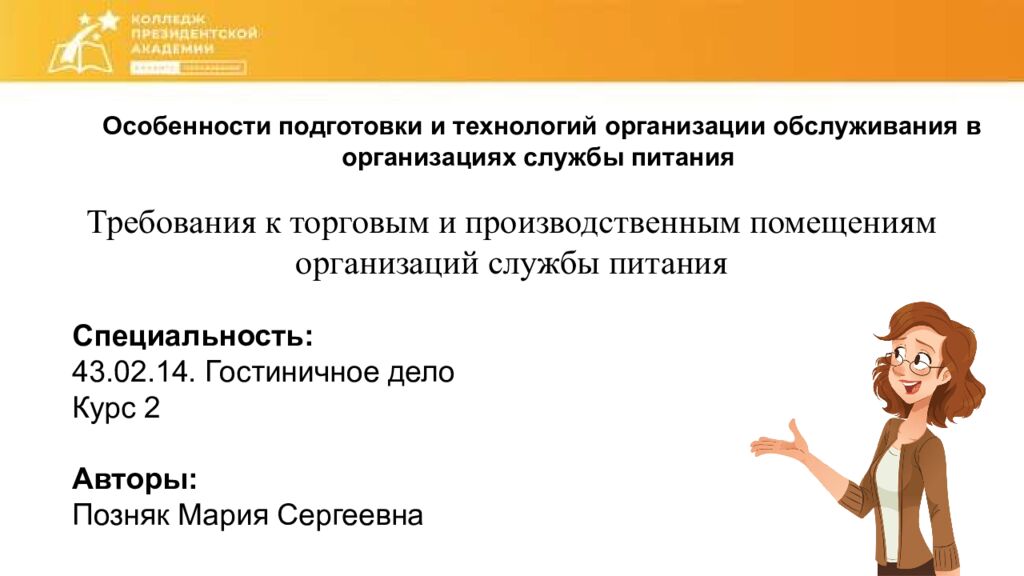 Специальность : 43.02.14. Гостиничное дело Курс 2 Автор ы : Позняк Мария Сергеевна Особенности подготовки и технологий организации обслуживания в организациях службы питания Требования к торговым и производственным помещениям организаций службы питания