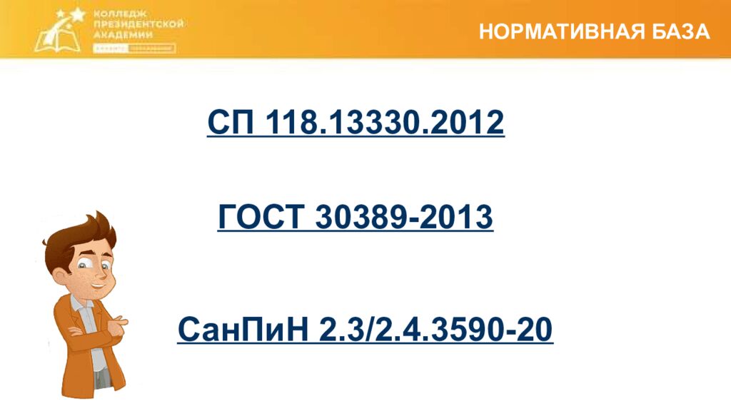 НОРМАТИВНАЯ БАЗА СП 118.13330.2012 ГОСТ 30389-2013 СанПиН 2.3/2.4.3590-20