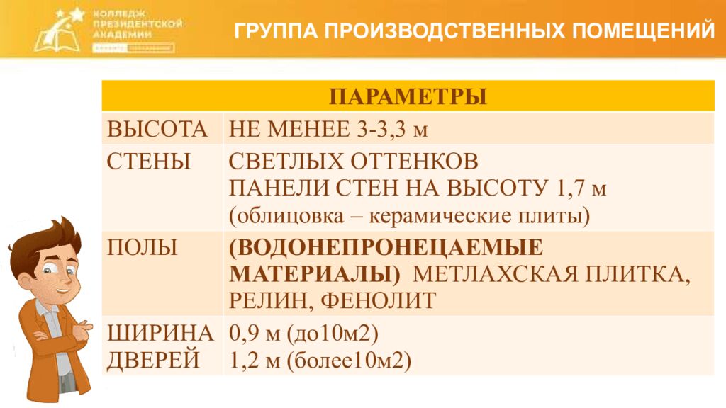 ГРУППА ПРОИЗВОДСТВЕННЫХ ПОМЕЩЕНИЙ ПАРАМЕТРЫ ВЫСОТА НЕ МЕНЕЕ 3-3,3 м СТЕНЫ СВЕТЛЫХ ОТТЕНКОВ ПАНЕЛИ СТЕН НА ВЫСОТУ 1,7 м (облицовка – керамические плиты) ПОЛЫ (ВОДОНЕПРОНЕЦАЕМЫЕ МАТЕРИАЛЫ) МЕТЛАХСКАЯ ПЛИТКА, РЕЛИН, ФЕНОЛИТ ШИРИНА ДВЕРЕЙ 0,9 м (до10м2) 1,2 м (более10м2)