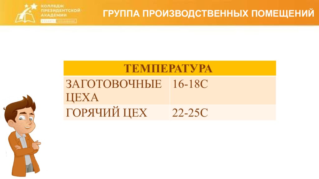 ГРУППА ПРОИЗВОДСТВЕННЫХ ПОМЕЩЕНИЙ ТЕМПЕРАТУРА ЗАГОТОВОЧНЫЕ ЦЕХА 16-18С ГОРЯЧИЙ ЦЕХ 22-25С