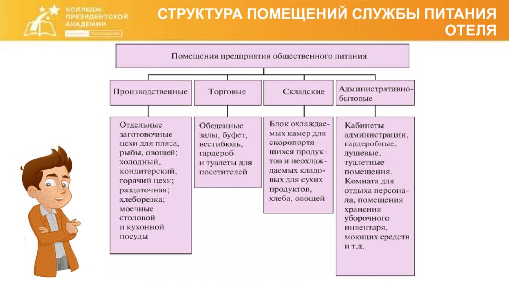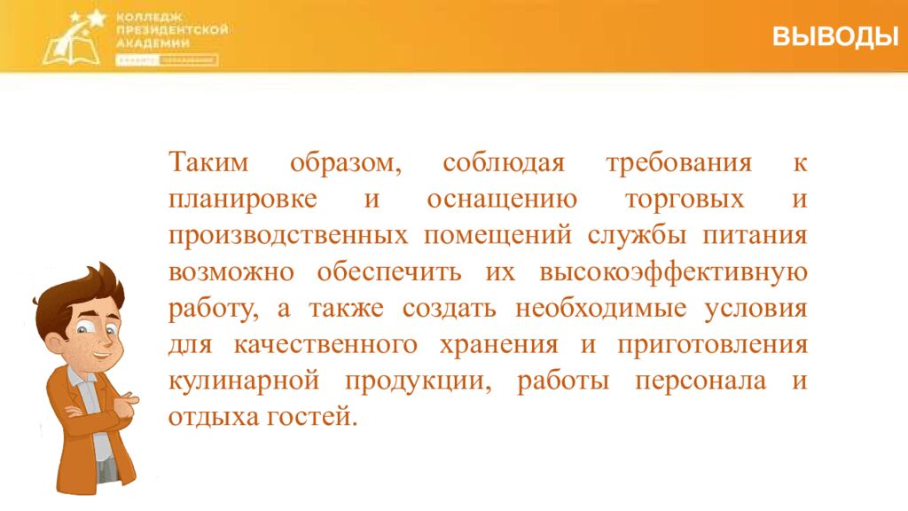 ВЫВОДЫ Таким образом, соблюдая требования к планировке и оснащению торговых и производственных помещений службы питания возможно обеспечить их высокоэффективную работу, а также создать необходимые условия для качественного хранения и приготовления кулинарной продукции, работы персонала и отдыха гостей.