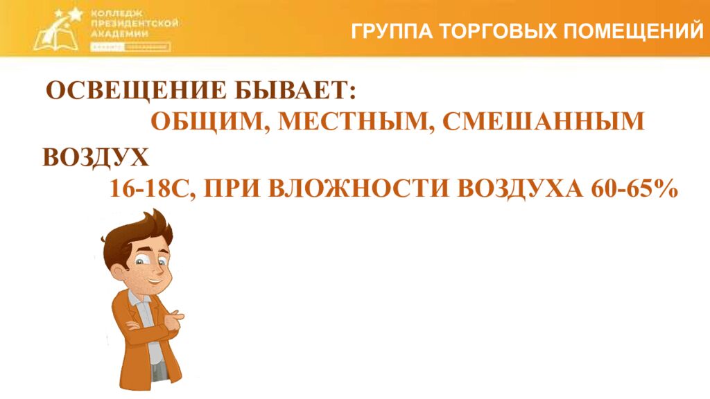 ГРУППА ТОРГОВЫХ ПОМЕЩЕНИЙ ОСВЕЩЕНИЕ БЫВАЕТ: ОБЩИМ, МЕСТНЫМ, СМЕШАННЫМ ВОЗДУХ 16-18С, ПРИ ВЛОЖНОСТИ ВОЗДУХА 60-65%
