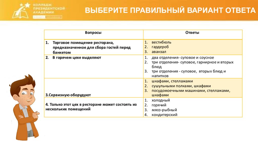 ВЫБЕРИТЕ ПРАВИЛЬНЫЙ ВАРИАНТ ОТВЕТА Вопросы Ответы Торговое помещение ресторана, предназначенное для сбора гостей перед банкетом вестибюль гардероб аванзал 2. В горячем цехе выделяют два отделения- суповое и соусное три отделения- суповое, гарнирное и вторых блюд три отделения - суповое, вторых блюд и напитков 3. Сервизную оборудуют шкафами, стеллажами сушульными полками, шкафами посудомоечными машинами, стеллажами, шкафами 4. Только этот цех в ресторане может состоять из нескольких помещений холодный горячий мясо-рыбный кондитерский