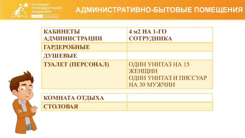 АДМИНИСТРАТИВНО-БЫТОВЫЕ ПОМЕЩЕНИЯ КАБИНЕТЫ АДМИНИСТРАЦИИ 4 м2 НА 1-ГО СОТРУДНИКА ГАРДЕРОБНЫЕ ДУШЕВЫЕ ТУАЛЕТ (ПЕРСОНАЛ) ОДИН УНИТАЗ НА 15 ЖЕНЩИН ОДИН УНИТАЗ И ПИССУАР НА 30 МУЖЧИН КОМНАТА ОТДЫХА СТОЛОВАЯ